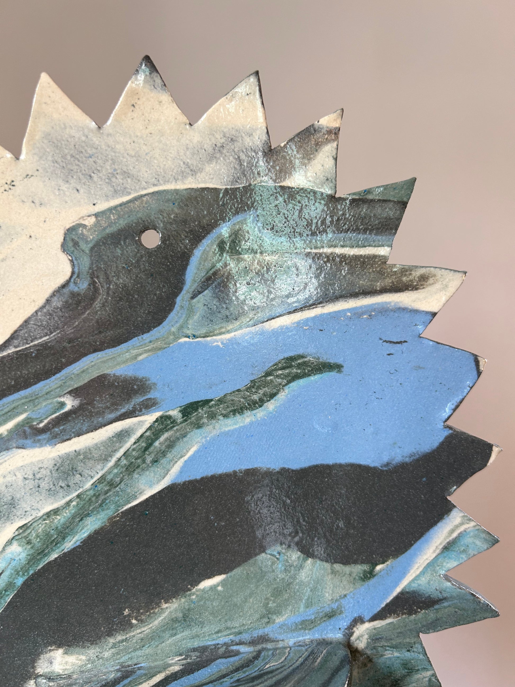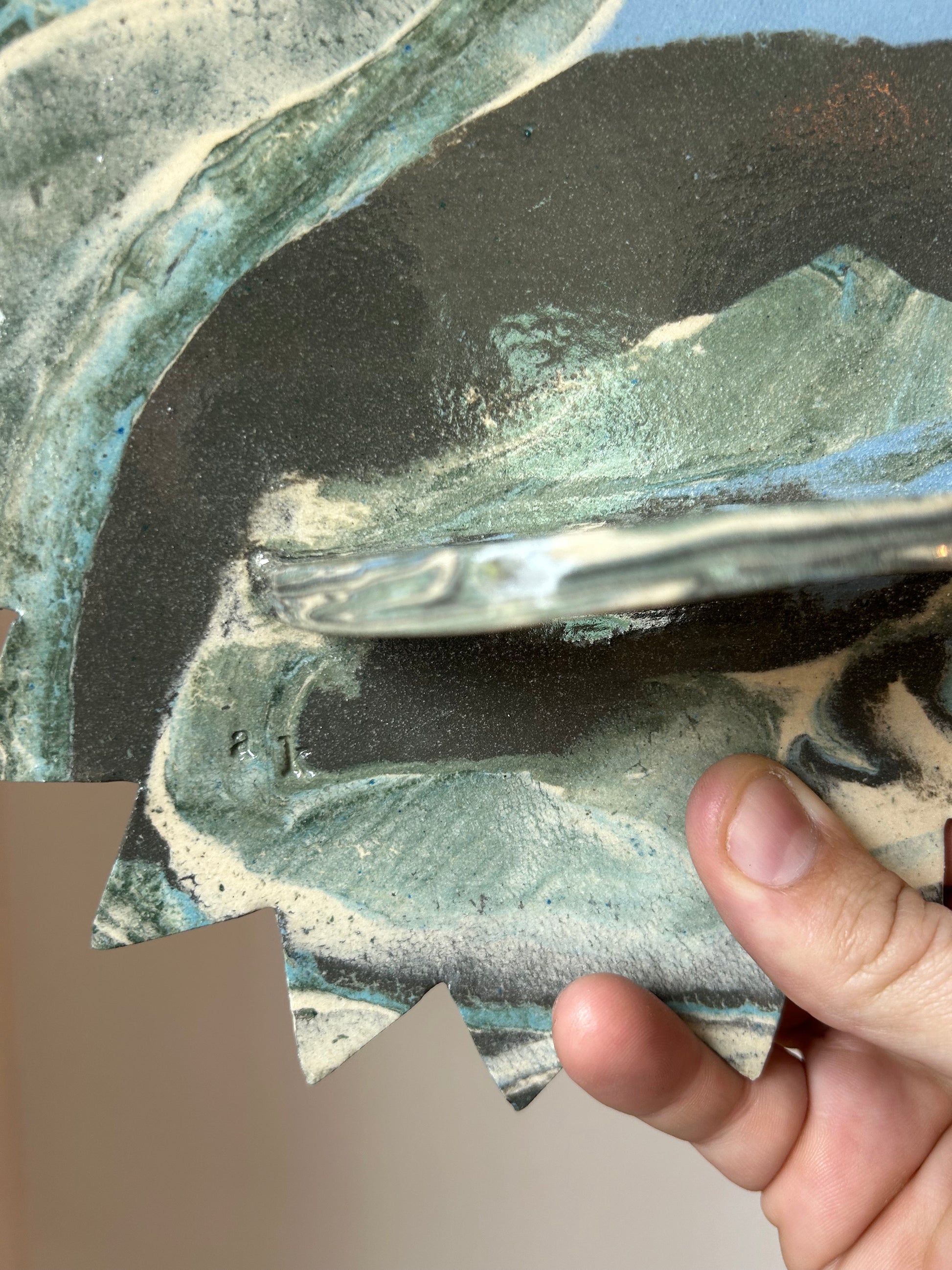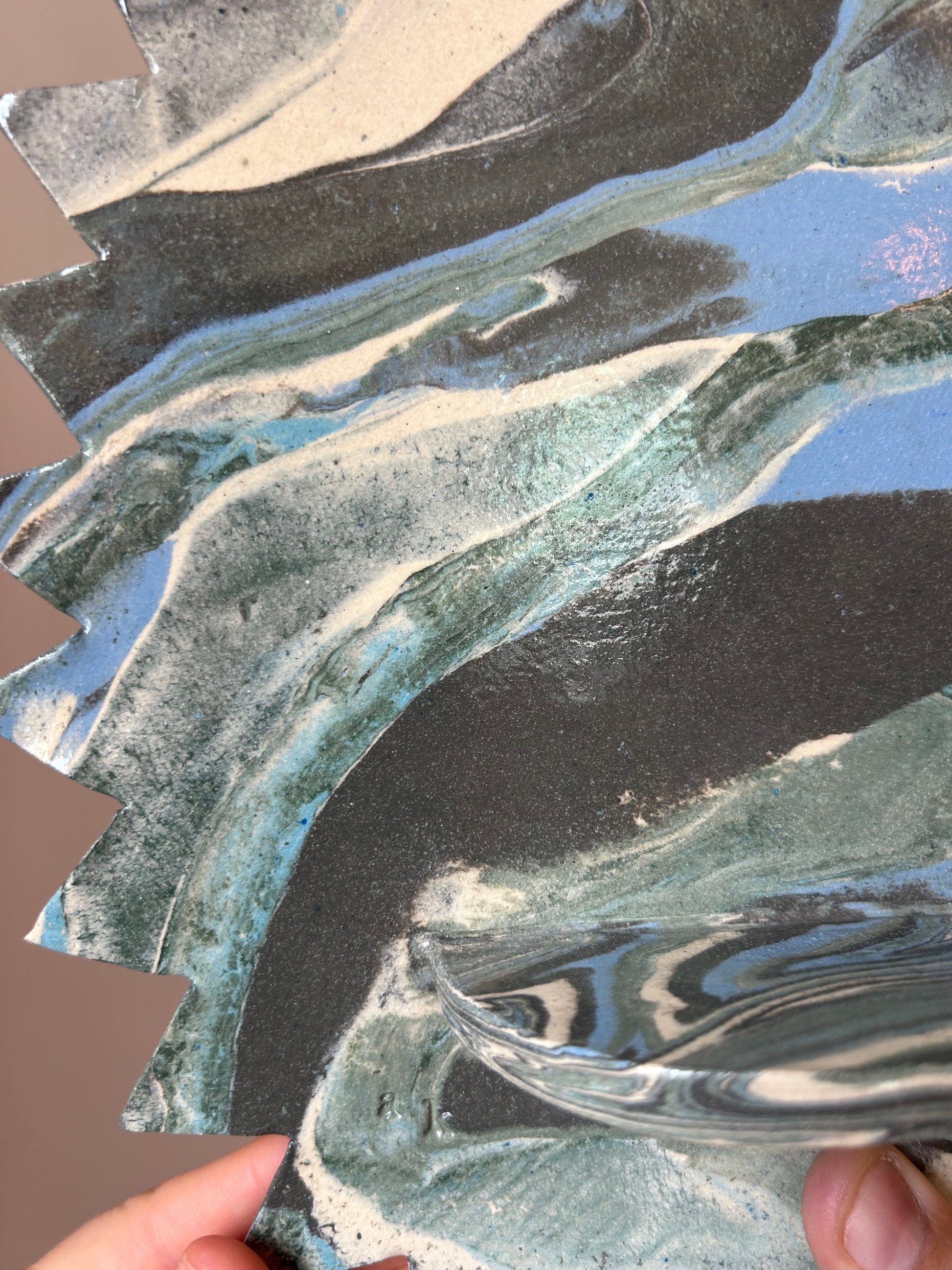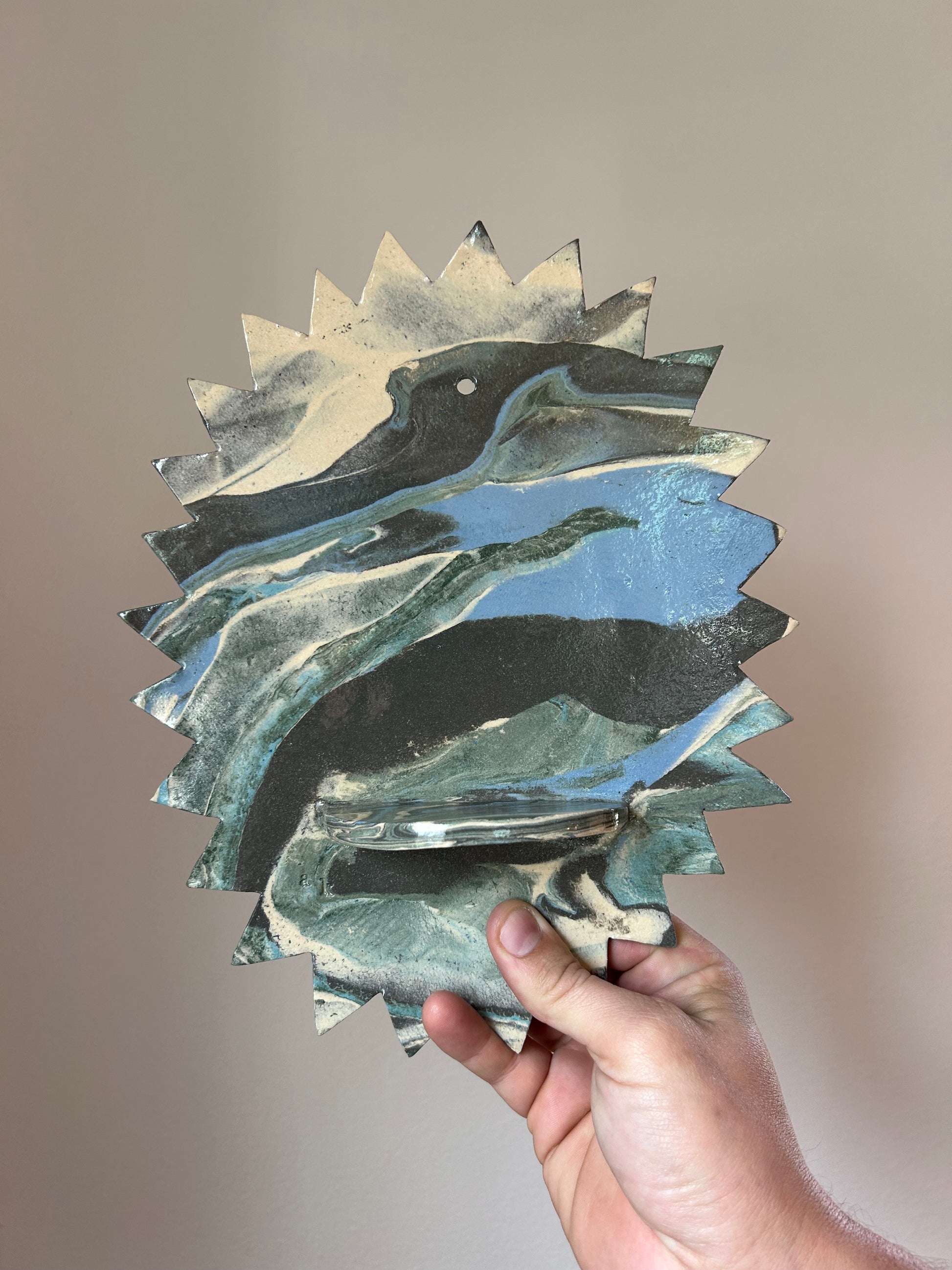 The clay itself is marbled with different blues, greens, and white with a clear glaze over it. I make this by separately wedging each blue and green pigment into a white clay to turn the whole clay that color. I then stack the different colored clay and wedge that to make this marble. After wedging, I roll it into a slab using a rolling pin, freehand the star edges, and measure and attach the shelf. Once the altar is dry I fire it in the kiln, then brush it with a clear glaze, and fire it again to make the final product.