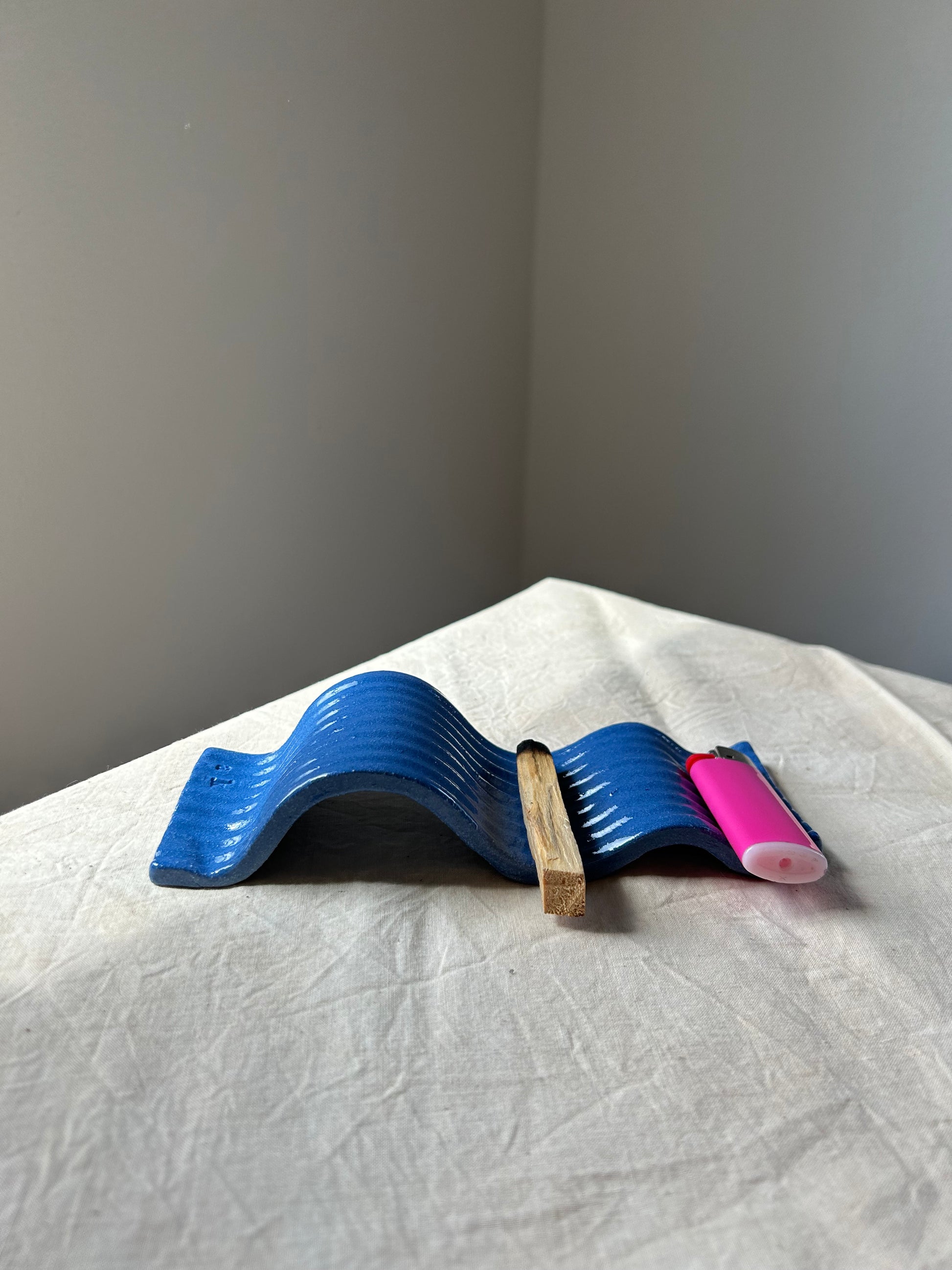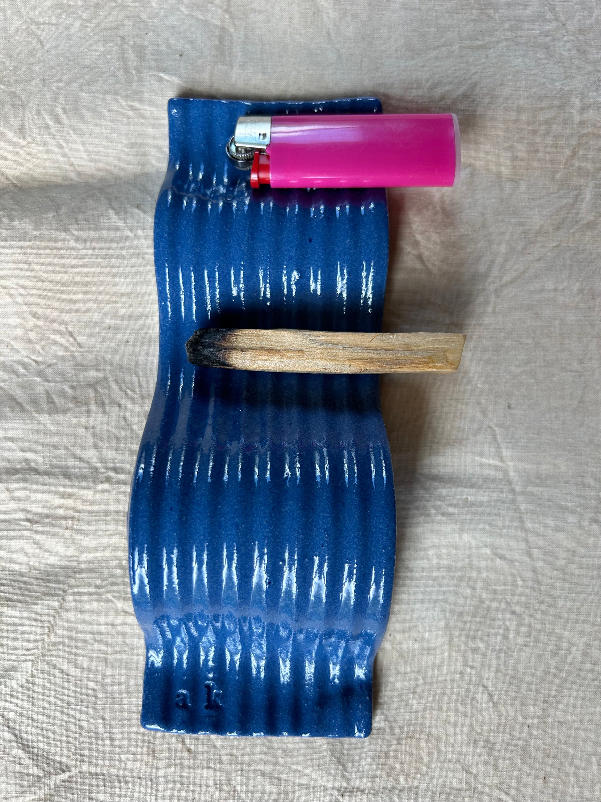 A very textured and wavy incense holder for palo santo, sage, cone incense, anything of the like. You can even rest a lighter or some matches on the end. The clay itself is wedgewood blue with a clear glaze over it.